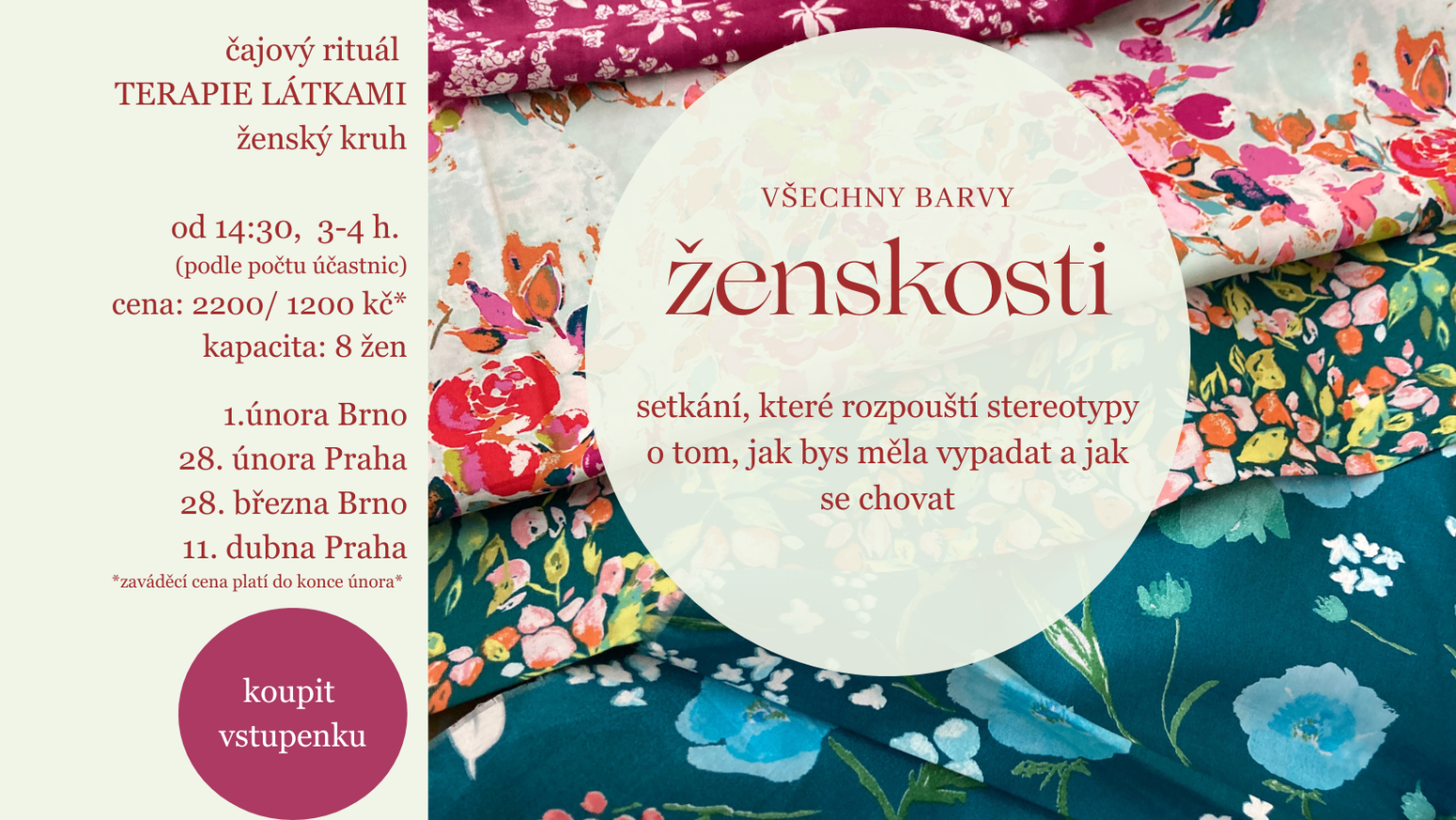 Všechny barvy ženskosti Prostor pro ženy, které už nechtějí žít v cizích očekáváních.Skrze látky, ticho, krásu a sdílení v malém kruhu se znovu spojujeme se svým tělem, cítěním a vnitřní jasností. 👉 Zjistit víc o setkání